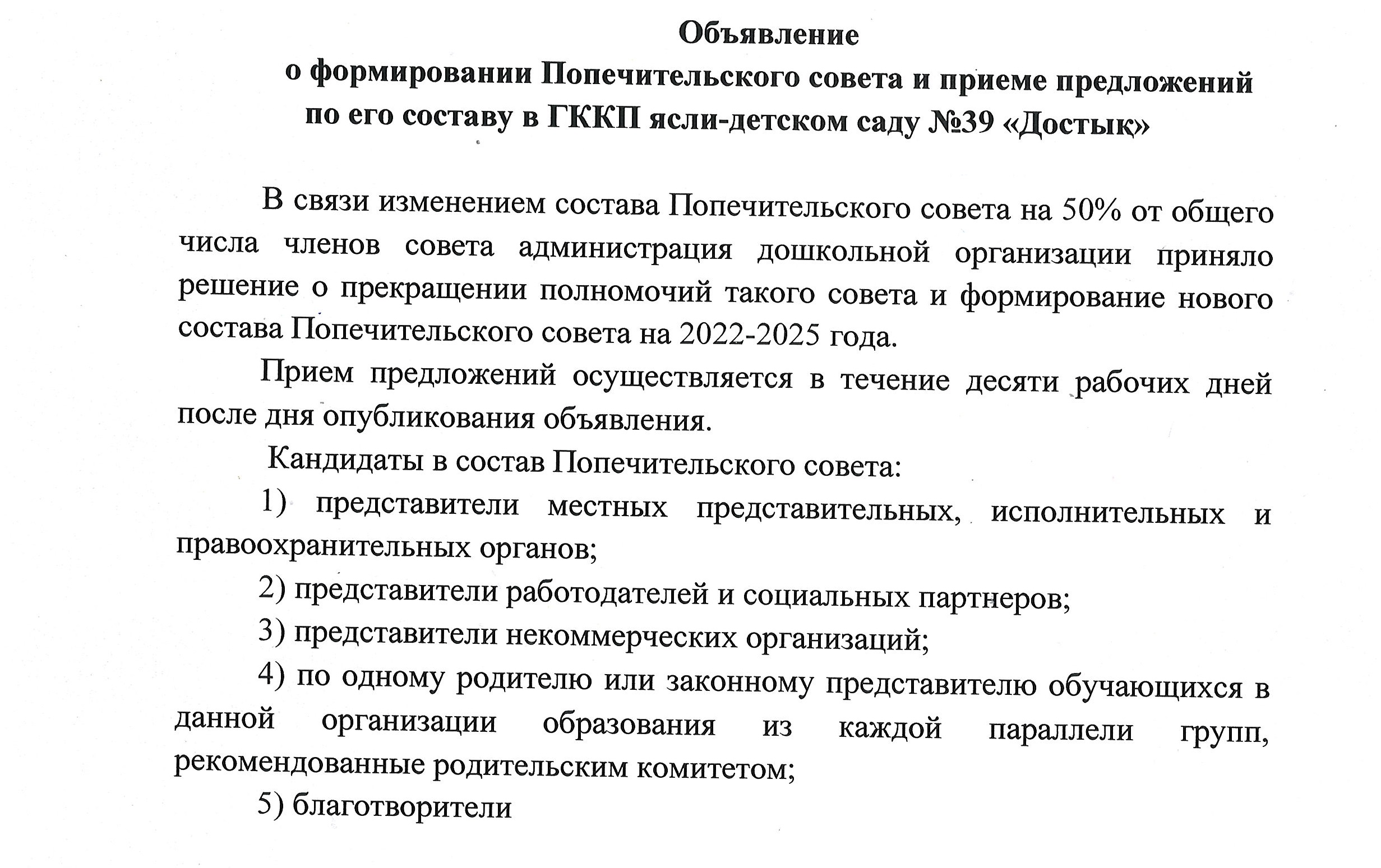 5 мая 2022 года в 14.00 в ГККП ясли-детском саду N39 “Достық”, расположенного по адресу улица Чекалина, 36 проводится заседание Попечительского Совета